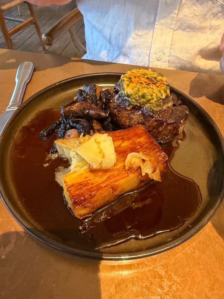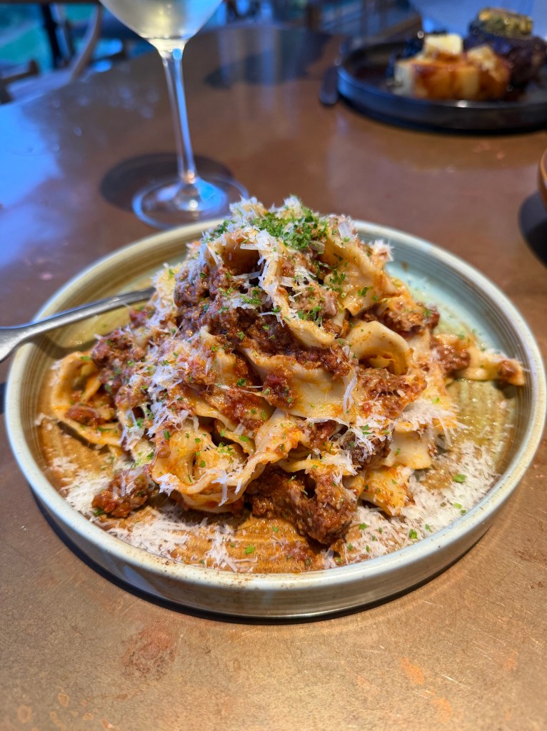 For the mains I got a riccia pasta with beef ragu and parmesan while Matt ordered the angus aged eye fillet with mushrooms and this insane potato galette. Phone did not eat first with Matt’s dish, and that is fair because, potatoes- duh.
