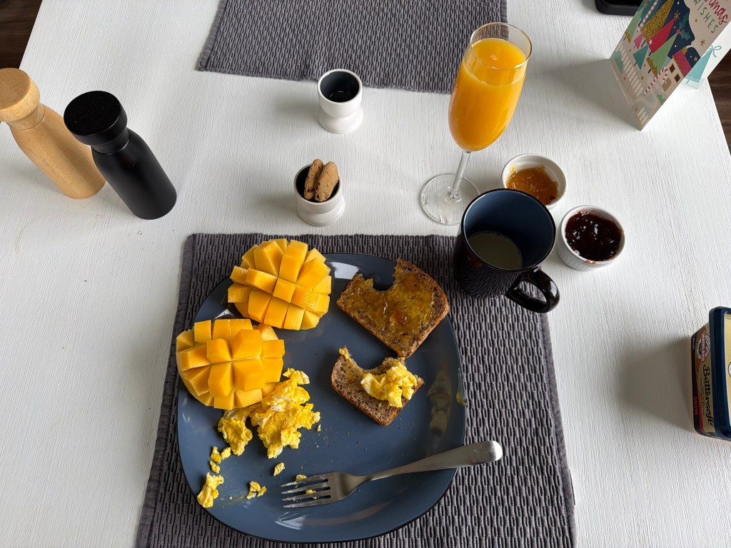We awoke on Christmas morning surrounded in a thick fog, blanketing the Airbnb, river, and surrounding pastures. The sun was trying hard to pierce the fog, but at this point it was unsuccessful and left us with a perfect excuse to lounge about and stay in bed. I did some writing and then eventually hunger took over and it was time to make a nice Christmas breaky! Fresh farm eggs from our host, strawberry matcha latte, orange juice, toast with jam, fruit- the works! Our Airbnb had 2 cozy robes and we took full advantage!