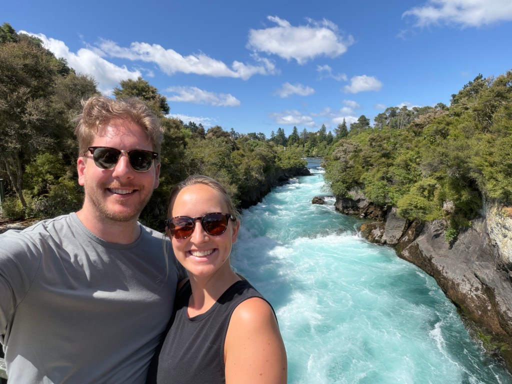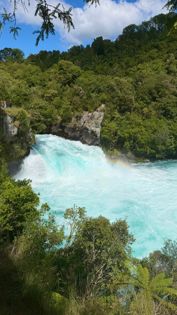 To break it up a little bit, we stopped at the well known Huka falls. It was BUSY but worth it and we lucked out on parking, to top it off. The water was insanely blue as 200000L p/m flowing out of Lake Taupo was forced into a small slot canyon- creating a raging river before spilling out over a ledge into the water below.