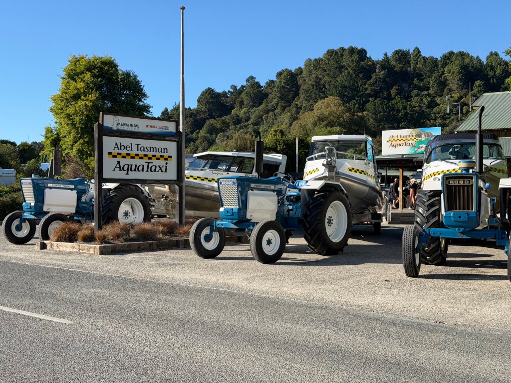 So we parked our car and walked to Abel Tasman Aquataxi for our pre-booked ride. First off, walking up to a line of boats hooked up to blue and white painted tractors is just such a cool sight to start to the day. I love how Kiwis think and operate!