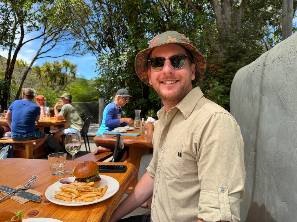 We backtracked south and decided to get a good lunch to really “start” our trip. And, because it was Matt’s birthday, we decided burgers and a glass of wine was the right move. Feeling high on life, we talked about backpacking more often and actually planning the Mont Blanc trip we keep talking about. This was also our first “camp site” we were seeing in Abel Tasman and, very deceitfully, thought: perhaps each stop on the trail is like this? Spoiler alert, no other stop was like this. AKA no other stop had a restaurant and/or even drinkable water for that matter.