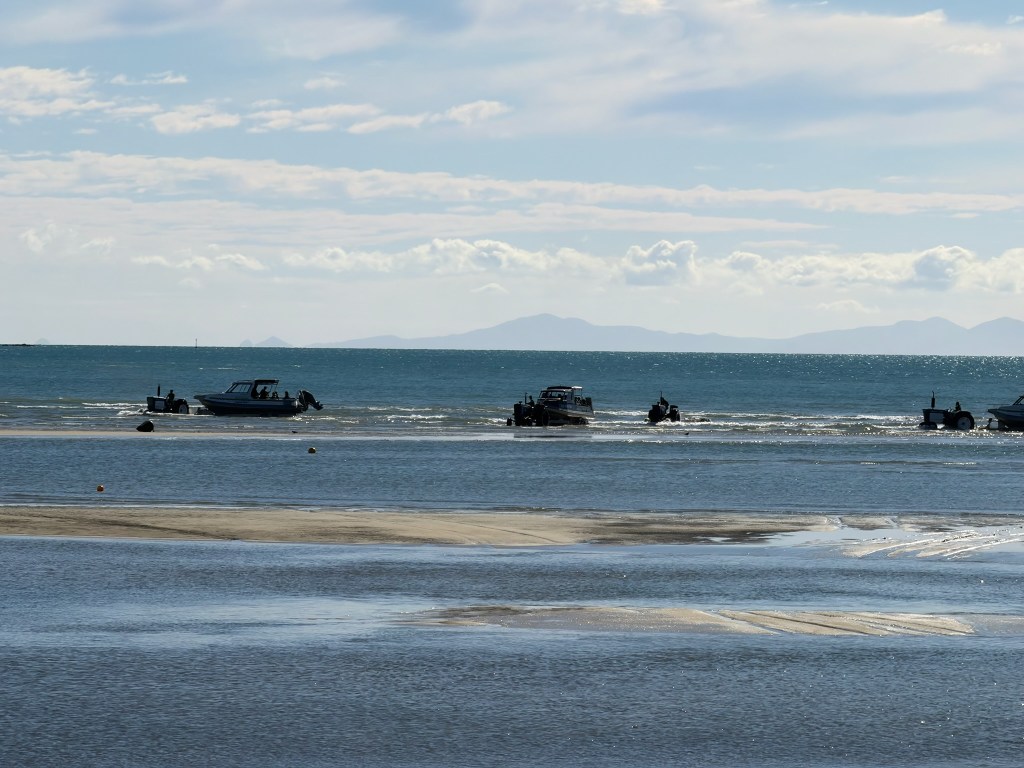 We then got in a bus that drove a short distance to the beach where our tractor-boat combo met us and we boarded right there on the side of the road. The tide was clearly on its way out, and we watched in amazement, as multiple tractor-towing-boats drove down the boat ramp and onto the beach, then into the shallow water.