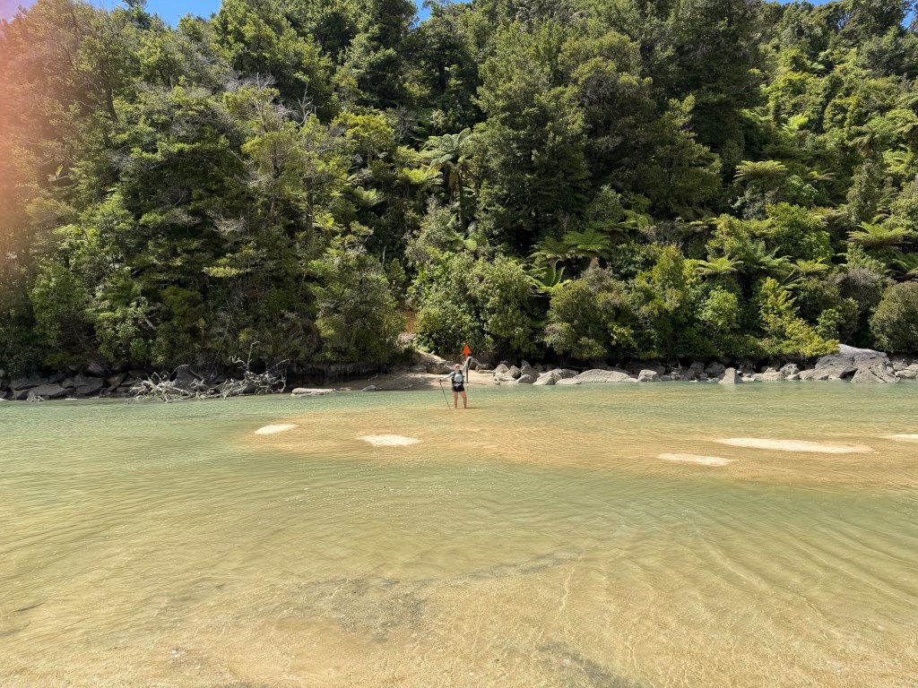 We first walked north a little bit to explore the Awaroa tributary which is only crossable at low tide. Venturing out, the path is marked with poles that have an orange circle at the top. It was vast and wide and it made more sense why there was so much emphasis on tidal charts- you would not want to get stuck out there when the tide was coming in!