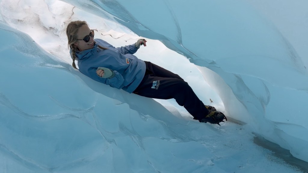 We were taken to a waterfall, an ice cave, and a hole in the ice along our journey. Once small rocks get into the ice, the heat from the sun warms the rocks and melts the ice underneath. This creates a little pocket and with more melting, some of those pockets turn into tunnels. At the right angle, it might create a little spout for water to escape out of like this one!
