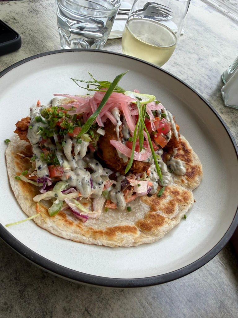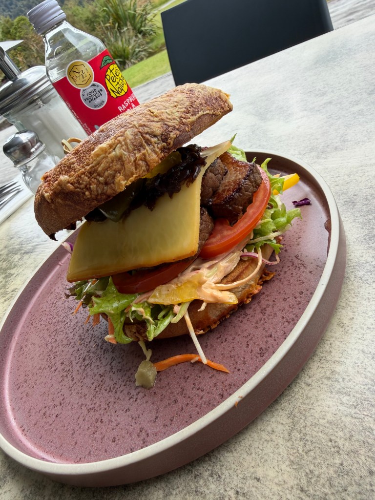Back on the ground, after our helicopter ride down (during which our pilot showed us a huge collapse in the glacier!), we had sure worked up an appetite! One of the guides recommended Lake Matheson Cafe so we headed there. Matt got the brisket with jalapeño on a bagel (YUM) and I got the Crispy Roti with Korean chicken- both were so very tasty.