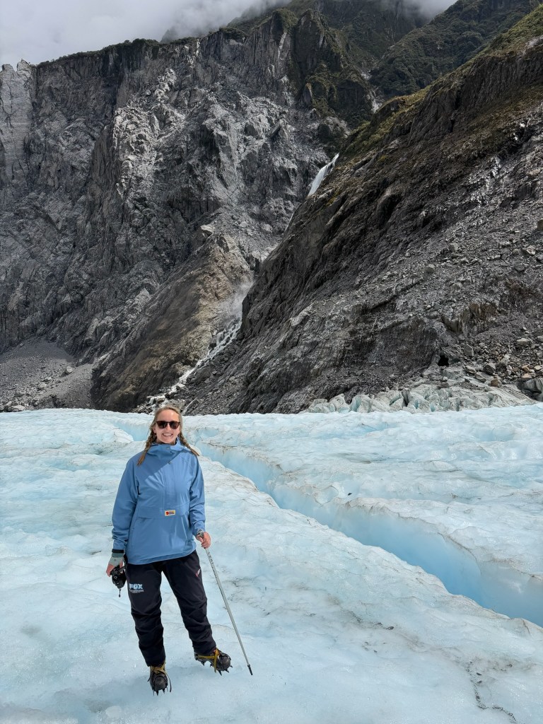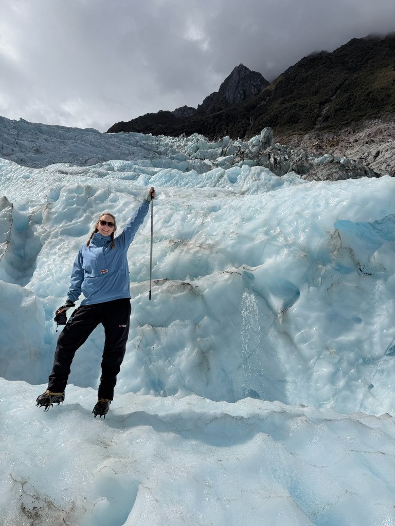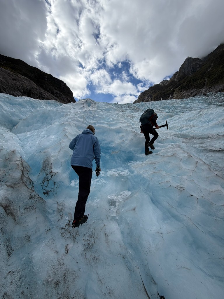 Because the ice is slowly moving down the face of the mountain, and the fact that Fox Glacier is particularly steep, it is constantly changing shape. Some parts of the glacier move 3-6 meters per day! Other parts much less. Looking up the glacier you could see various trail workers chipping away at the ice and making paths for us to follow. Lots of ice stairs! It was so impressive to see how much work goes into it just to have the ice shift and need to do it all again the next day.
